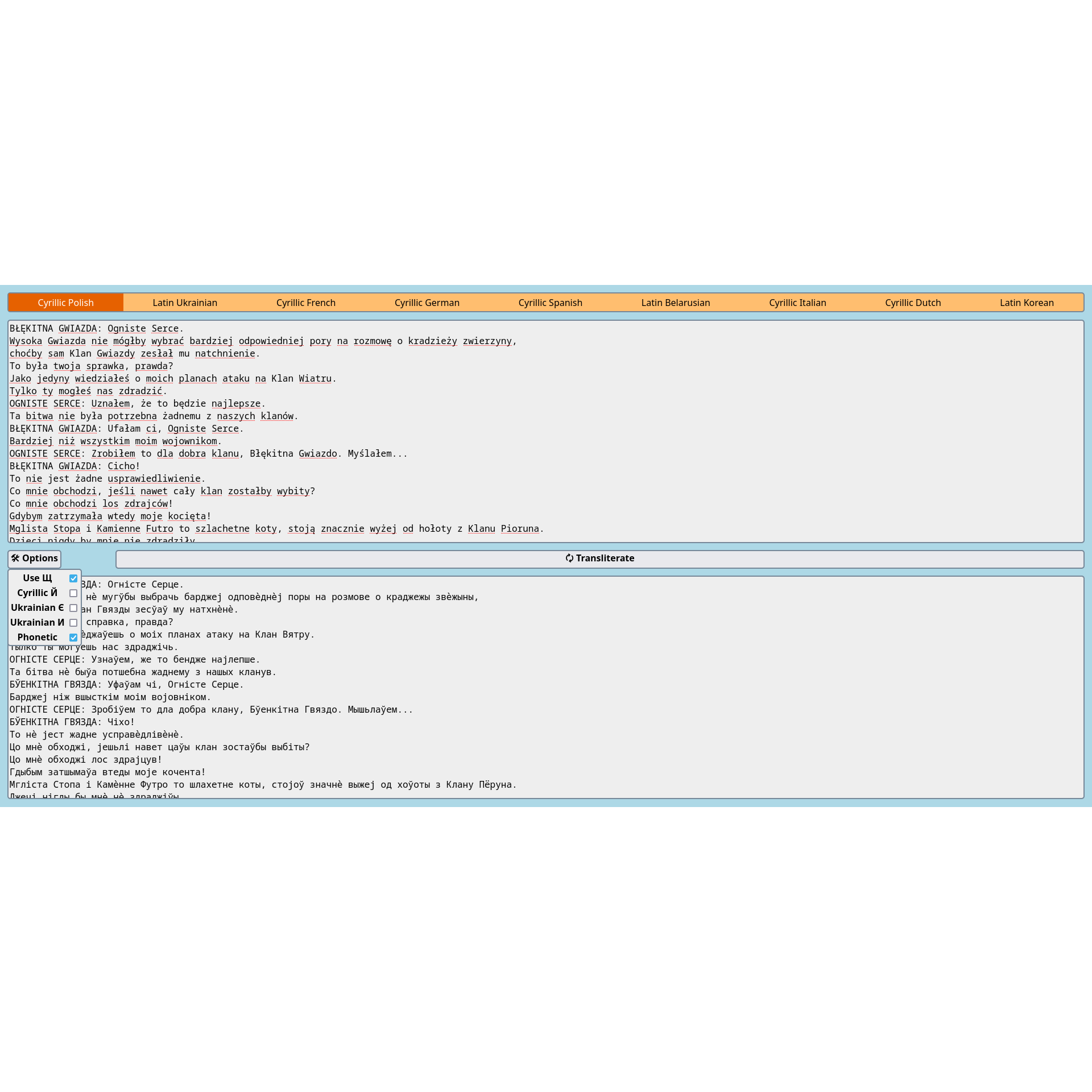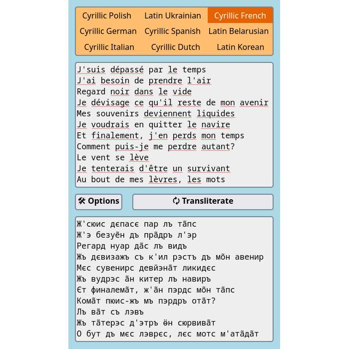 Languages canonically written using the Latin script are converted to using Cyrillic, while a few Cyrillic-based languages are rewritten in Latin. SkryptAU does not adhere to any official transliteration standards and is based solely on my own ideas, while offering a few options to customize its behaviour. Orthographic exceptions handling is provides for French (extensive) and Spanish (a few common words). Licensed under MPL 2.0; you are free to contribute ;)